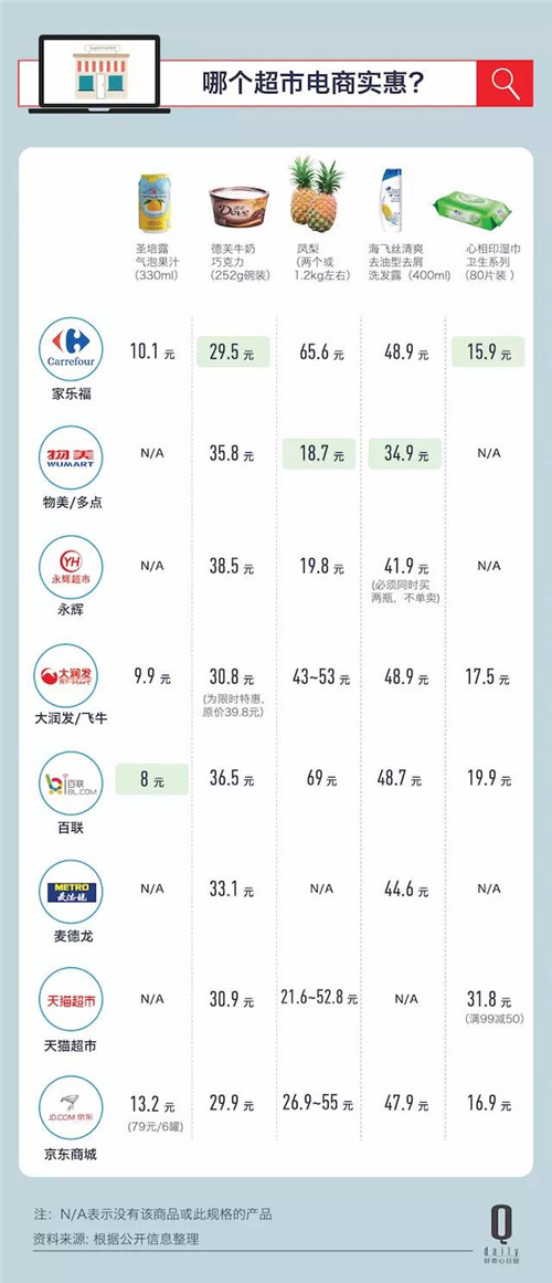 從包裝食品、進(jìn)口食品、生鮮到日化產(chǎn)品,我們隨機(jī)選擇了五個產(chǎn)品比較了一下價格。天貓超市和京東的價格優(yōu)勢不是那么明顯了。天貓超市經(jīng)常會有提價再打折的情況(知乎有不少人也反映這種情況),比如心相印濕紙巾在天貓上雖然有滿 99 減 50 的折扣,但實際上它的原價就是這款產(chǎn)品最便宜的渠道——家樂福的兩倍。從隨機(jī)抽選的 5 個產(chǎn)品來看,家樂福和物美的價格比較吸引人。