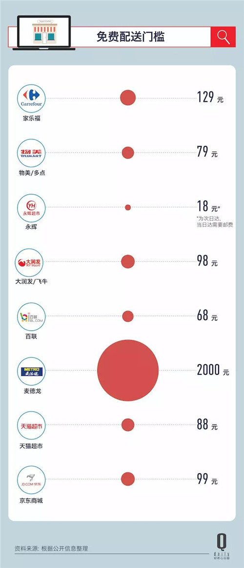 另外一個問題是生鮮免費配送門檻比較高(和普通商品同價)。比如,百聯(lián)需要 68 元,飛牛需要 98 元。其實,包括更成熟的天貓超市和京東也有類似的問題,分別需要滿 88 元和 99 元才能免郵費,生鮮電商天天果園的包郵門檻也要 68 元。