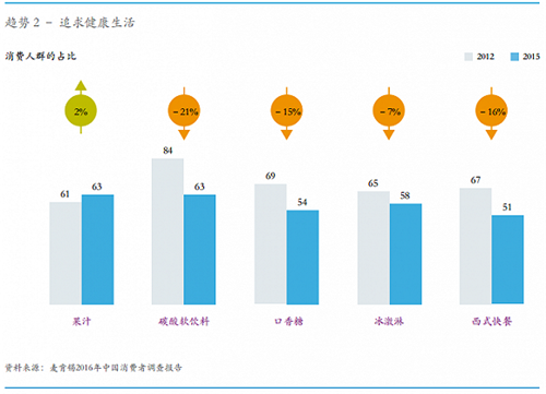 麥肯錫數據顯示,碳酸飲料、冰激凌、西式快餐等消費人群占比均有下降,而果汁的消費人群占比則有小幅提升。