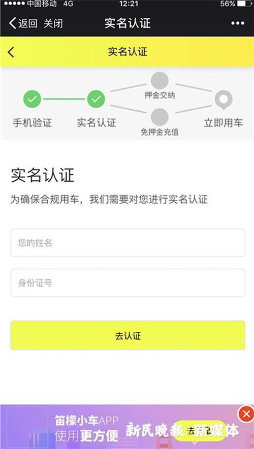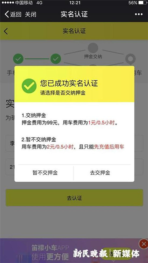 這輛黃色小車車身上貼有二維碼,并寫著“掃碼一元用車”,右側后輪安裝有四位密碼鎖。小新嘗試掃碼,跟共享單車注冊流程相似,需要手機注冊和實名認證。實名認證后,則可選擇是否交納押金,按提示說明,兩者在后續使用費用上存在差異,交納99元押金后的使用價格便宜一些,半小時1元。
