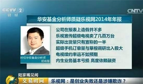 2015年6月,華安基金分析師楊曉磊公開質疑樂視2014你年報,他認為公司在報表上的造假并不多,但據測算,樂視宣傳超級電視賣了幾百萬臺,但實際出貨量只有宣稱的一半、超級手機訂單量也與草根調研數據出入極大,電視續約率遠不如預期,內生業務基本虧損,高度依賴融資。