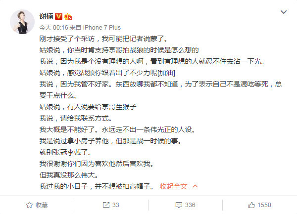 如今這句話被套用在了《戰狼2》上面,一向低調的謝楠發文澄清,許多網友也表示支持謝楠,紛紛留言稱:“所以你才是吳京的老婆啊!!”、“說的非常好,日子是自己過得,自己感知其中的酸甜苦辣,沒有必要必須賦予什么。還有,蹭熱評的高仿真的不希望打擾人家。”、“可能大家是太喜歡電影和你們這對夫妻了才會這樣的,小姐姐不要有壓力,做自己就好,不用因為網友的評論就非要走偉光正的人設,我們喜歡的就是率直可愛的楠姐,你就做那個小小的可愛的自己就好。”