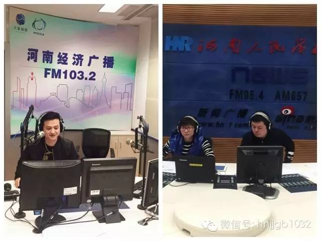 本部直播室中,河南經濟廣播主持人蘇鵬(左一)和河南新聞廣播主持人趙蕾(右二)、私家車999主持人莫非(右一)正在并機直播。