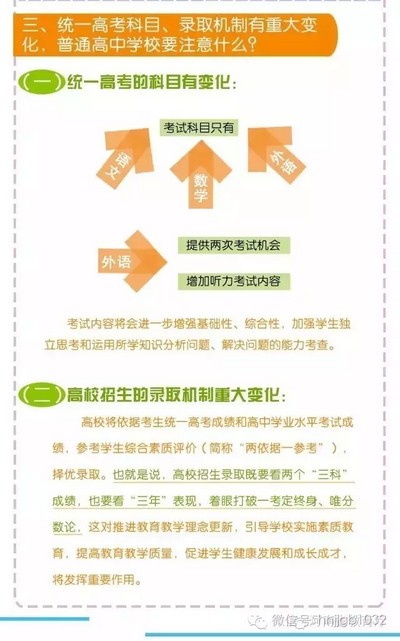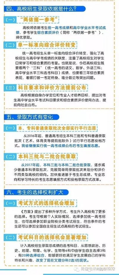 按照《方案》要求,我省從2018年秋季入學的普通高中一年級學生開始啟動高考綜合改革,考生總成績由統一高考的語、數、外3科成績和高中學業水平3個選考科目成績組成。招生錄取實行基于統一高考成績和高中學業水平考試成績、參考學生綜合素質評價擇優錄取機制。