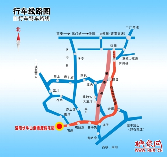 1、 洛陽—洛欒高速—欒川縣下高速—欒川石廟鎮—伏牛山滑雪度假樂園(140公里)