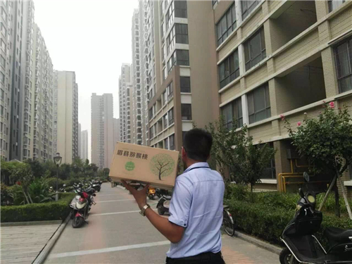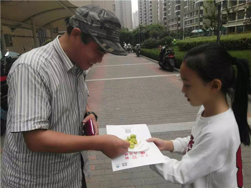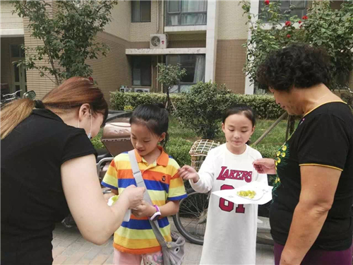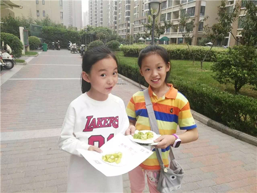 看我們兩位小小志愿者,把新鮮美味的獼猴桃送給小區的居民品嘗。