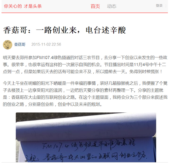 自媒體,以“香菇哥”的名義在各個自媒體平臺申請入駐,最先申請的是搜狐媒體平臺,運作的這幾個月,搜狐上的累計閱讀量目前已達到16萬。后來又申請了今日頭條,一點咨詢,鳳凰新聞媒體平臺等渠道。也建立了自己的微信公眾號。目前所有的宣傳渠道的累計閱讀量已經突破了七十萬。就是在這些渠道上宣傳自己的創業故事以及大山里面的人文風情來傳播。
