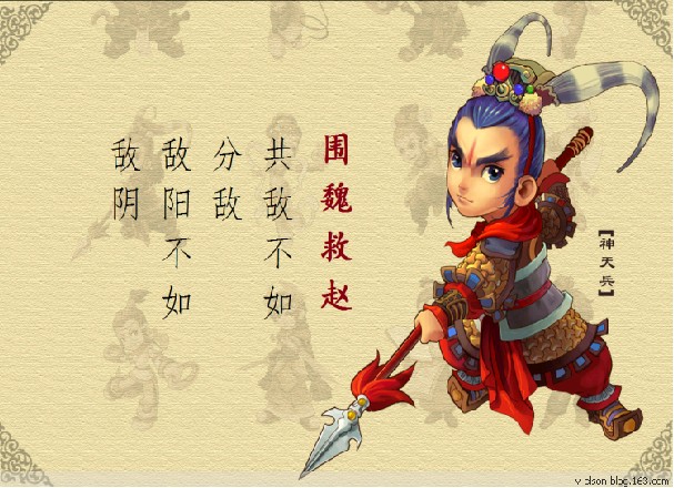 譯文:攻打兵力集中的敵人,不如設法使它分散兵力而后各個擊破;正面攻擊敵人,不如迂回攻擊其薄弱空虛的環節。本指圍攻魏國的都城以解救趙國。后指襲擊敵人后方的據點以迫使進攻之敵撤退的戰術。現借指用包超敵人的后方來迫使它撤兵的戰術。