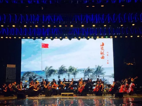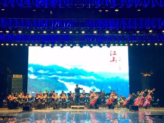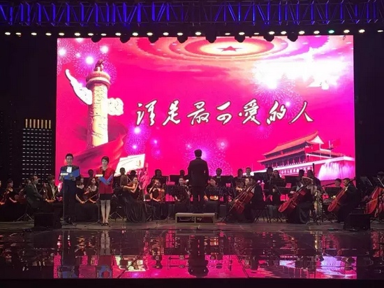 伴隨臺上指揮黃俊博的手勢起,河南愛樂樂團開始演奏交響樂《紅旗頌》。
