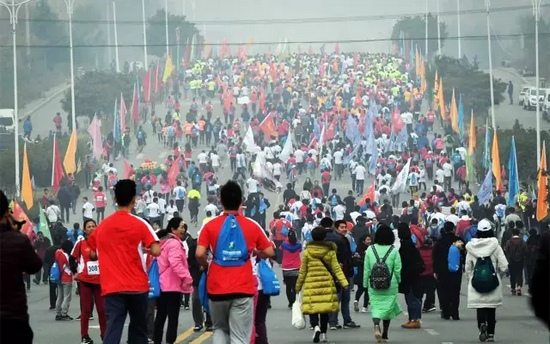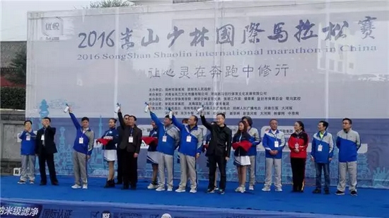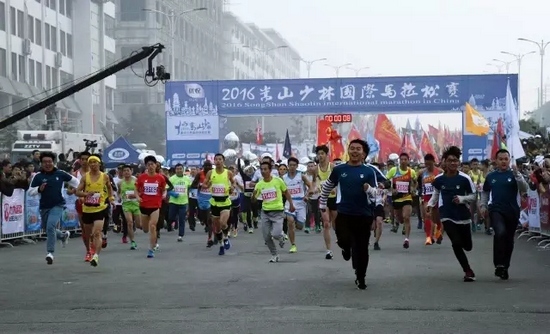 11月13日上午,隨著2016嵩山少林國際馬拉松賽發令汽笛鳴響,來自世界16個國家和地區的近15000名跑友跑出起點,瞬間匯聚成流動的七彩人潮,為嵩山美景增架起一道絢麗的彩虹。