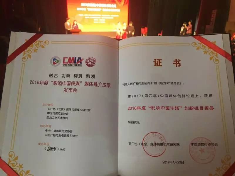 我們魅力881河南音樂廣播獲得2016年度”影響中國傳媒“最具創(chuàng)新力媒體獎,《魅力881晴雨表》獲得2016年度“影響中國傳媒”創(chuàng)新欄目獎,DJ 陽陽出席論壇及典禮,與來自全國的媒體同仁進行交流,分享廣播影視產(chǎn)業(yè)的寶貴經(jīng)驗。