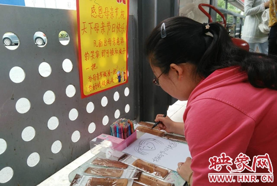 映象網快訊(記者 何葉 文/圖)昨天(5月14日)是母親節,在金水路快速公交站臺內,別樣的慶祝母親節活動正在進行著,凡是在站臺內畫出母親慈祥笑容的乘客,都能獲得梳子一把,為辛勞的母親梳梳頭。