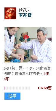 映象網汝州訊(記者 楊增強)河南仁醫,感動中國!映象網記者12月26日獲悉,“感動中國”2017年度候選人物已經投票已經開始,由河南省委宣傳部選報的我省候選人汝州市金庚康復醫院院長宋兆普入圍,網友可關注央視網投票頁面(點擊下圖)為這位河南仁醫進行投票。