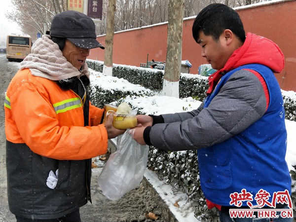 早上開車路過的二公司79路車長張鵬輝看到環衛工奮力除雪的情景,中午下班后悄悄地和同事買了40個包子和20杯小米粥驅車到文化路北四環送到環衛工手中。