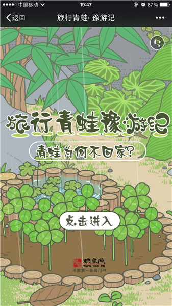 映象網的H5特別策劃《旅行青蛙豫游紀》,更是將H5結合網絡熱點,通過那只網絡爆紅的旅行青蛙,將政府工作報告中的關鍵詞以獨特的視角展示給網友,讓網友們感嘆原來政府工作報告還要這樣的打開方式。截止目前H5總pv超過23萬。