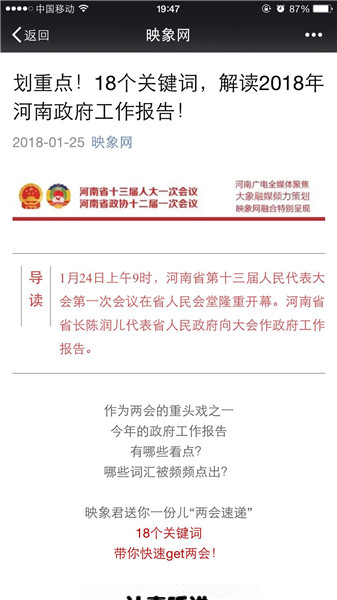 映象網官方微信策劃推出原創(chuàng)策劃《河南人,2018給你穩(wěn)穩(wěn)的幸福!》、《你好,我是河南!這是我的五年成績單,請接收!》、《2018年,河南都有哪些“小目標”?》、《劃重點!18個關鍵詞,解讀2018年河南政府工作報告!》。每篇都刷屏朋友圈,網友積極轉發(fā)點贊,稱“看完真的覺著穩(wěn)穩(wěn)的幸福”。