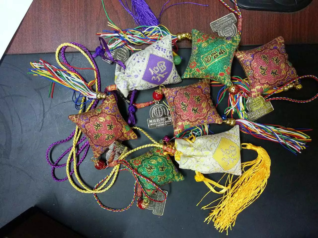 端午節佩香囊,不但有避邪驅瘟之意,而且有襟頭點綴之風。香囊內有朱砂、雄黃、香藥,外包以絲布,清香四溢,再以五色絲線弦扣成索,作各種不同形狀,結成一串。