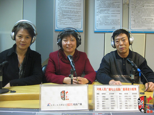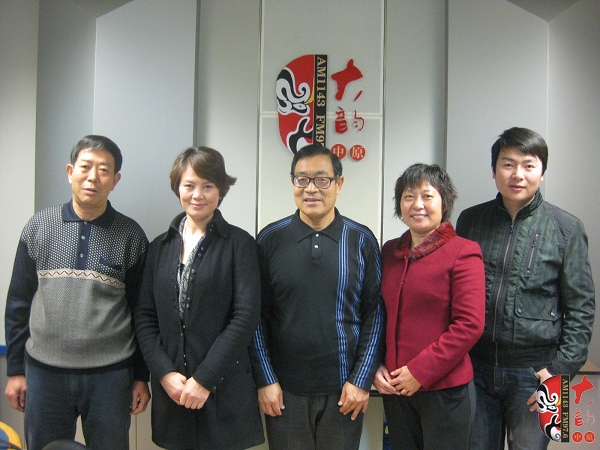 ?。ㄗ笃穑鸿鬈幩囆g團主任聶衛國、副團長兼主要演員李風莉、團長李春友、主任魏桂愛和著名戲曲節目主持人戲曲廣播“當家小生”月陽在直播間