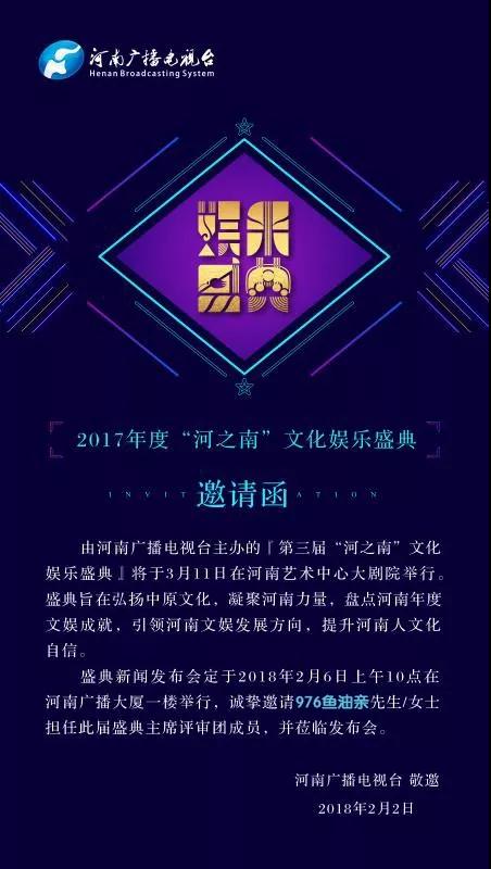 盛典新聞發布會定于2018年2月6日上午10點在河南廣播大廈一樓舉行,誠摯邀請976魚油親先生/女士擔任此屆盛典主席評審團成員,并蒞臨發布會。