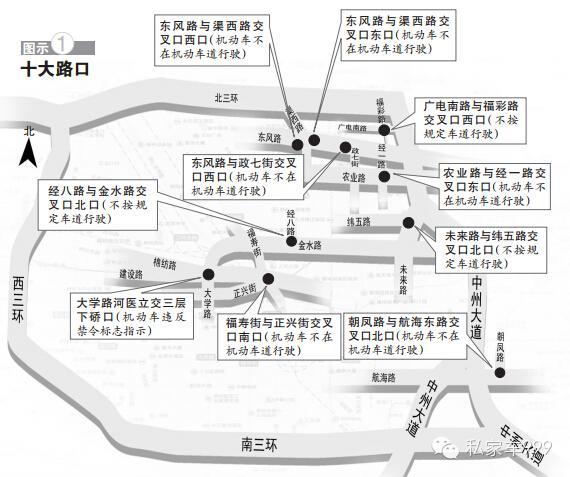 1、經八路與金水路交叉口北口(不按規定車道行駛)