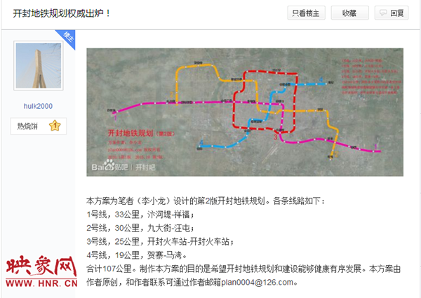 【傳聞】11月初,網絡上謠傳“開封要修建地鐵,市區內規劃了4條線路”不少開封市民在網上看到一則關于開封要修建地鐵的消息,引來一片熱議,同時市民在論壇上也有發帖熱議。