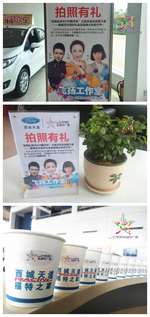 6月3日起至6月9日,凡999聽眾至聯盟商家店內拍下私家車廣播logo以及“飛揚工作室”任一相關信息,并發送關鍵詞“發現999”至我們微信公眾平臺,同時留下你的“姓名+電話”,前50位車友均可獲贈2升機油!