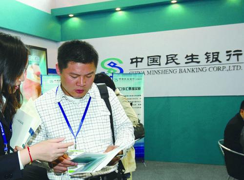 民生銀行(600016)上海分行工作人員正在向企業主介紹有關信息。 張衡年/攝影