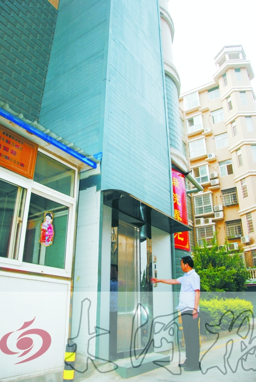 昨日傍晚6時許,記者在新密市一小區3號樓前見到了這部依樓而建直達頂樓7樓的電梯。小區物業部的韓經理說,這部電梯是去年10月份建成的,僅供7樓住戶李先生家使用。李先生在煤礦工作,家中的經濟條件不錯。