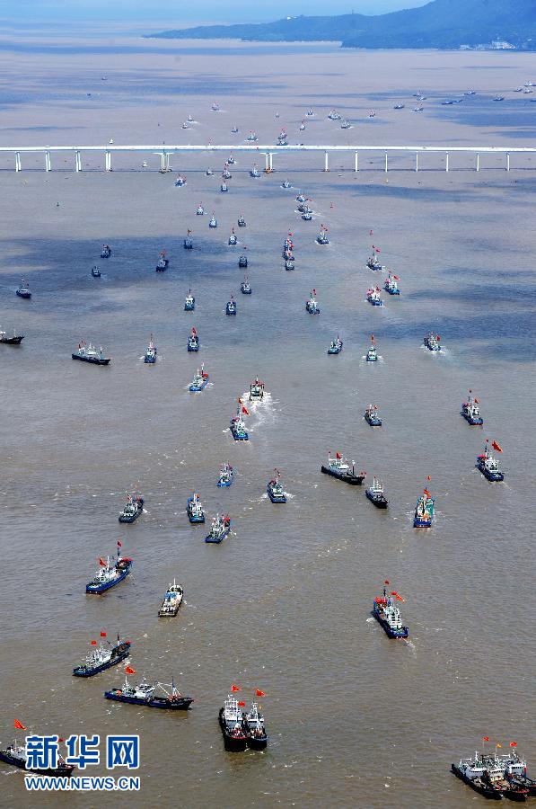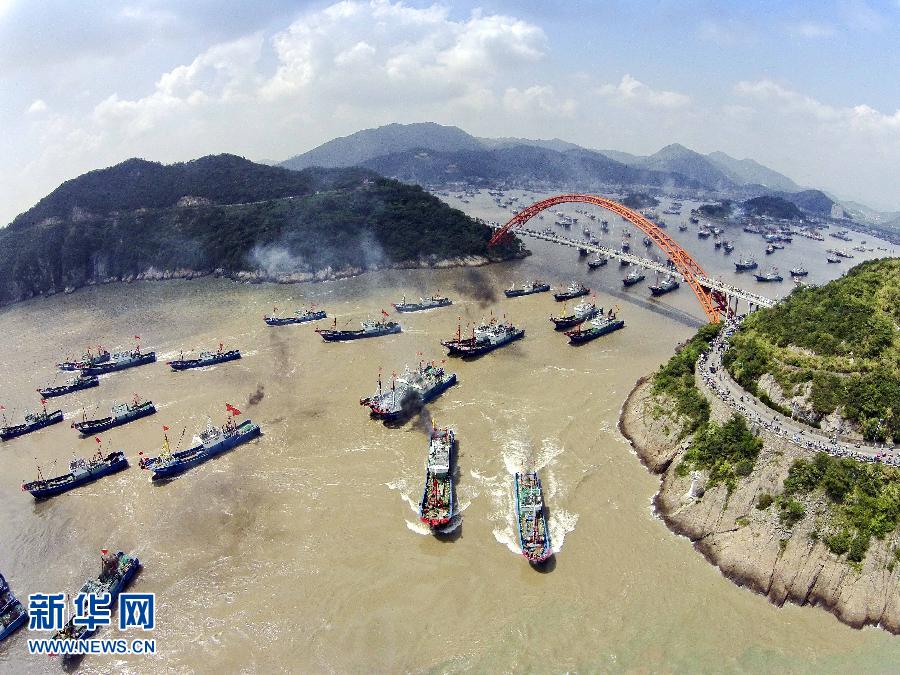 9月16日,浙江省舟山市沈家門漁港的漁船出港經過朱家尖大橋開赴漁場。當日,為期3個半月的東海伏季休漁結束,眾多漁船劈波斬浪,開往漁場。 新華社發(華志波 攝)