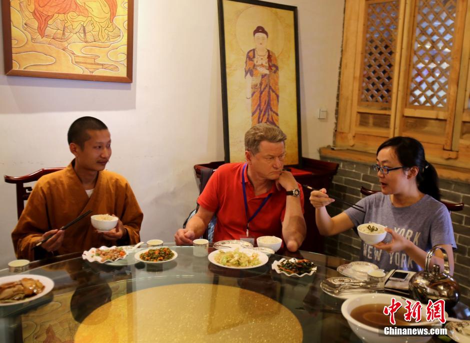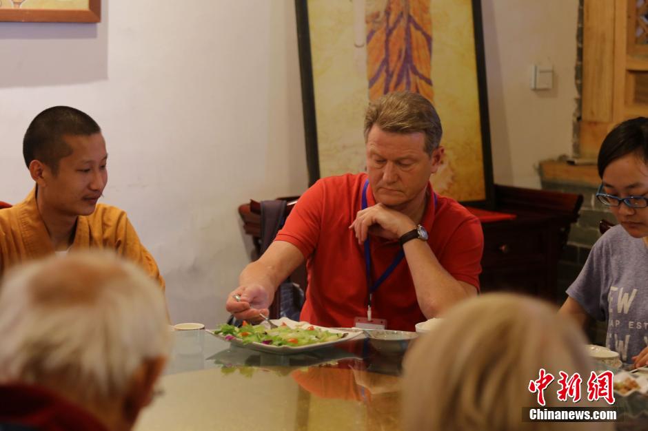 9月20日,河南登封少林寺,立陶宛前總統、現歐盟議員、國際特技飛行員羅蘭達斯·帕克薩斯與參加2015鄭州航展的明星隊員們參訪少林寺。羅蘭達斯在少林寺里吃齋飯。中新社發 王中舉 攝