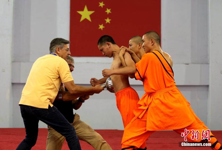9月20日,河南登封,前來參加2015鄭州航展的國際特技飛行員,在登封一所武校內用力想拔掉吸在少林弟子肚子上的飯碗,但拼盡全力,也未能成功。 中新社發 王中舉 攝