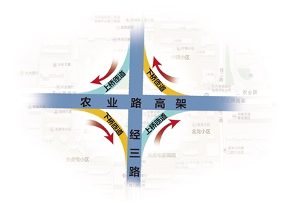 據了解,農業路高架與經三路交叉口處,共建設4條南北向上下橋匝道。目前,施工已接近尾聲,正在進行標識標牌安裝、隔離墩擺放等附屬工程的施工。這些工作預計最快下周將完成,隨后就可以試通車。屆時,沿農業路高架橋由西向東的車輛,可向南轉向經三路。沿農業路高架由東向西的車輛,可朝北轉向經三路。同時,車輛可從經三路由南向北駛上高架橋一路向東,也可以從經三路由北向南駛上高架橋,向西行駛。