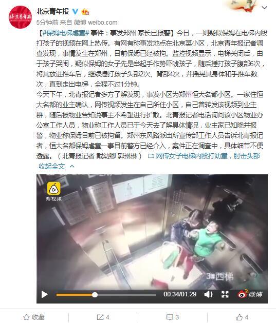 今日,一則疑似保姆在電梯內毆打孩子的視頻在網上熱傳。有網有稱事發地點在北京某小區,北京青年報記者調查發現,事情發生在鄭州,目前保姆已經被拘。監控視頻顯示,電梯關閉后,由于孩子哭鬧,疑似保姆的女子先是舉起手作勢嚇唬孩子,隨后捶打孩子腹部6次,將其放進推車后,繼續捶打孩子頭部2次、背部4次,并搖晃其身體和手推車數次,直到走出電梯,全程不過1分鐘。