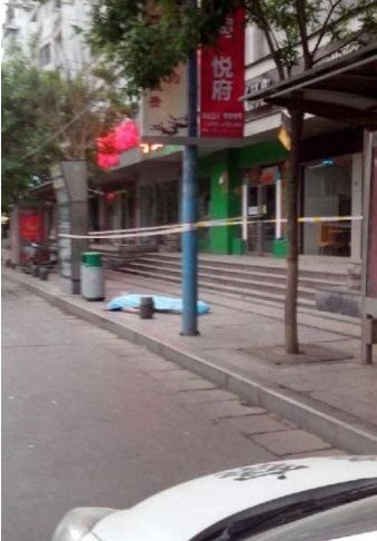 剛跑幾步,就聽到“咚”的一聲響了,回頭一看,一名男子掉在垃圾桶旁的人行道上,只穿了一條黑色內褲,滿身是血,“從沒見過這樣的場面,我嚇住了,身上沒有電話,只能喊人”。