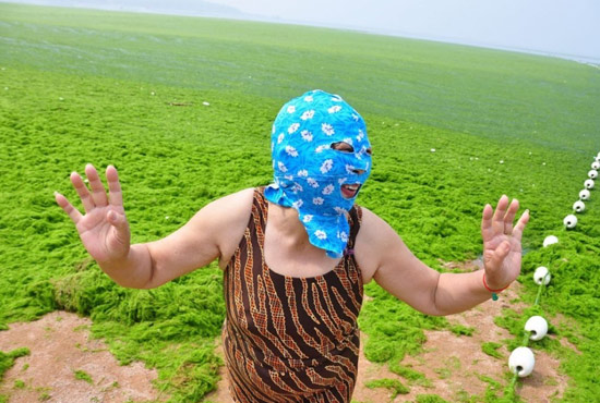 2013年7月3日,山東青島青島高溫來襲,“青島大媽”不懼滸苔,戴著“強(qiáng)盜面具”出現(xiàn)在海水浴場消暑降溫。 CFP