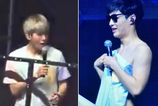 EXO在澳門演唱會上玩起現場換衣的橋段,成員頭部以下僅用白紙搭成的幕遮著,在燈光變換下可以看到團員脫衣的剪影,讓歌迷看得心癢癢,不料,當歌曲進行到一半,正在更衣的成員還跟著音樂擺動,紙幕就突然掉落,每個人都嚇得不知所措,已換好衣服的伯賢在一旁趕緊把紙拉起來,想擋住在一旁脫光的燦烈,沒想到越幫越忙,紙幕整個被撕開,工作人員只好也沖出來幫忙扶起布幕,場面爆笑又養眼,意外成為當晚表演最大亮點。