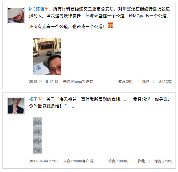 近幾日,三亞“海天盛筵”涉黃,淫亂派對的新聞可謂瘋傳網絡。早前有媒體報道,三亞市委宣傳部曾于4月4日向媒體發布新聞通稿,稱已經對網上有關“海天盛筵聚眾淫亂”傳聞展開調查,對此事非常重視。三亞警方今日已正式通知“海天盛筵”主辦方三亞鴻洲國際游艇會、“MC白色派對”主辦方MC俱樂部等相關單位負責人于4月8日面談,配合調查工作。今天,“海天盛筵”主辦方之一,候鳥俱樂部負責人陳駿發微博稱,自己已經將所有材料遞交三亞市公安局,將對那些還在繼續傳播詆毀造謠的人,堅決追究法律責任。希望可以還海天盛筵一個公道。