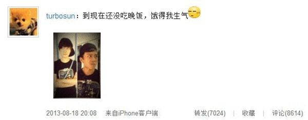 8月18日20點08分,孫儷通過微博曬和鄧超同傳情侶裝的照片,并稱:“到現在還沒吃晚飯,餓得我生氣!”照片中,兩人身穿黑色T恤情侶裝,很默契的把鴨舌帽的帽檐戴在后面,夫妻二人都歪眼斜視,橫眉冷對,看上去似有仇一樣。