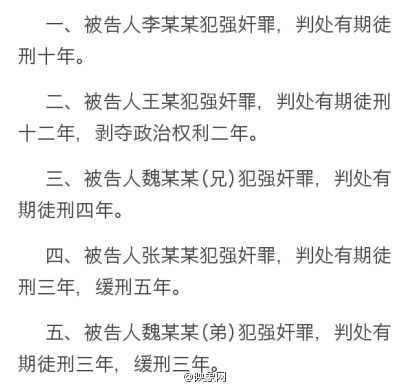 映象網訊 9月26日上午,北京法院網官方微博@京法網事 消息:李某某等5人強奸案一審宣判,其中,被告人李某某犯強奸罪,被判處有期徒刑10年。