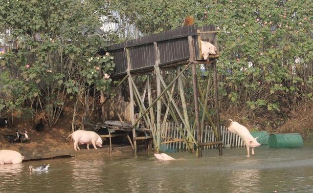 湖南寧鄉縣村民黃德民將飼養的土豬趕往高臺進行跳水鍛煉,來提高豬的免疫力,增加豬的進食量和生長速度,提高豬肉的品質和口感。