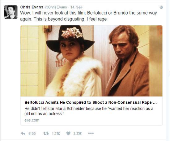 《美國隊長》克里斯·埃文斯(Chris Evans)也表示:“天啊,我再也無法像過去那樣看待這部片子、貝托魯奇或白蘭度,這已經超越了惡心,我覺得很憤怒!”他的發文也引來許多網友認同,連《歌喉贊》女主角安娜·肯德里克(Anna Kendrick)也在底下回應表示,“施耐德女士之前曾在訪談中說過,‘我曾提起過這件事情,聽的人(男人們)還翻白眼’。”