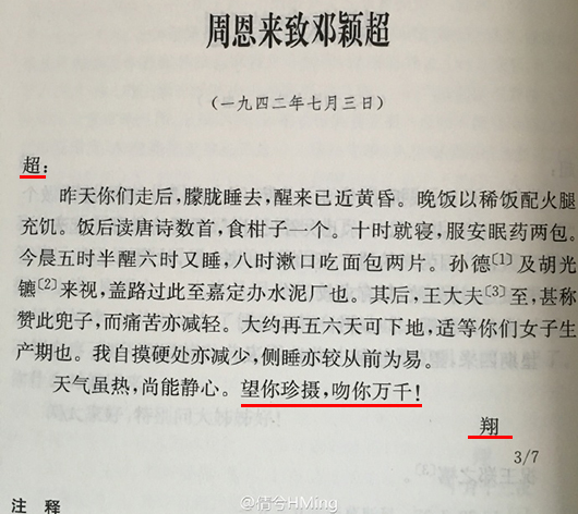 最近,新浪博主@倩兮HMing 送上了這把跨越數十年的,來自中央的高級狗糧:1942至1955年,9封周恩來與鄧穎超的往來書信。據觀察者網查詢,這些書信都出自《周恩來鄧穎超通信選集》,這本選集由中共中央文獻研究室編撰,1998年2月出版,全書約10萬字。