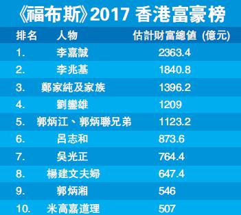 《福布斯》2017香港富豪榜。圖片來源于香港商報。