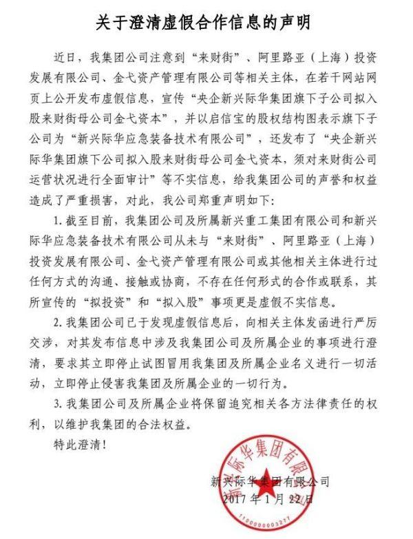 對于這一“抱大腿”的行為,新興際華1月22日在其官網發布《關于澄清虛假合作信息的聲明》,稱“央企新興際華集團旗下公司擬入股金戈資本,須對來財街公司運營狀況進行全面審計”為不實信息,并聲明新興際華及其所屬新興重工集團有限公司、新興際華應急裝備技術有限公司從未與來財街、阿里路亞(上海)投資發展有限公司、金戈資產管理有限公司進行過任何方式的溝通、接觸或協商,不存在任何形式的合作或聯系。