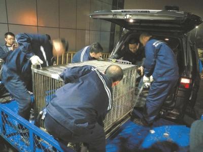 經過近一個半小時的空中旅行,剛下飛機的“蜀蘭”還有一點驚慌。面對機場運輸工作人員,她有些焦慮地在籠子里轉來轉去,變換姿勢。