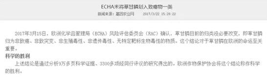 據中國經濟網記者了解,今年3月15日,歐洲化學品管理局(ECHA)風險評估委員會(RAC)也正式確認了確認草甘膦為非致癌物。