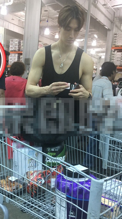 前天錦榮頂著中分發型、穿黑色背心、運動褲,露出結實胸膛與臂膀,打扮隨興,身旁沒有女伴。身高189公分的他鶴立雞群,一人推著購物車四處閑逛,在賣場約待了半小時,最后他買了烤雞跟日用品。