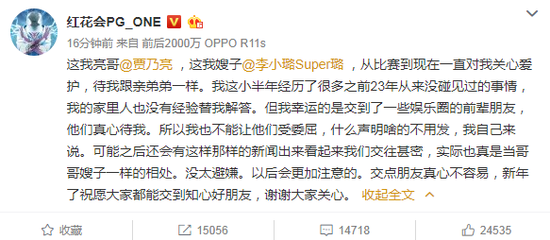 今天早前,某媒體曝出李小璐夜宿PG ONE家,但同一時間賈乃亮卻在直播中說老婆李小璐正在做頭發,引起網友猜疑。中午,PG ONE發微博澄清:不能讓他們受委屈。