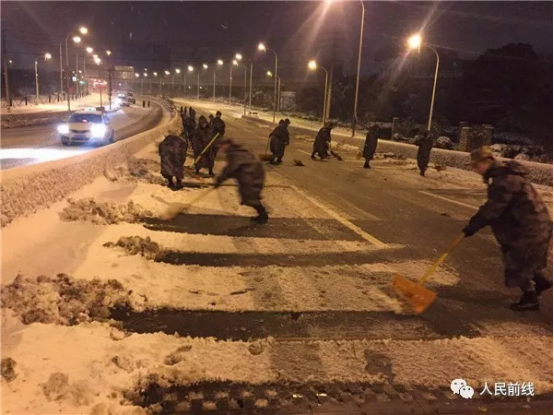 1月25日晚開始,東部戰區和江蘇省軍區緊急派出官兵,奔赴駐地掃雪除冰、清理道路,保障人民出行安全。