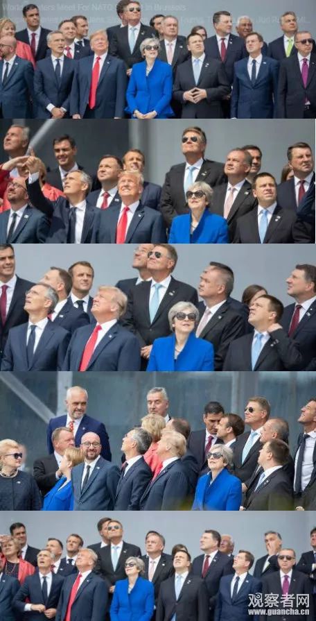 而這張神奇的照片里,幾乎所有人,包括法國總統馬克龍、德國總理默克爾、英國首相特蕾莎·梅這些“老朋友”,都看向自己的左邊,而特朗普則執著地望向右邊的天空。